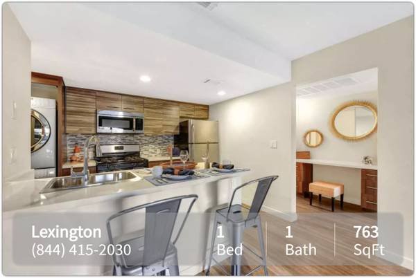 The Lexington Apartment Homes presents a featured floorplan: a one-bedroom, one-bathroom residence spanning 763 square feet.
