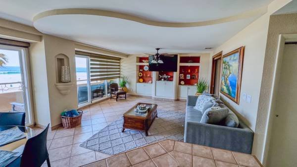 This lovely corner unit is a two-bedroom, two-bathroom beachfront condo situated in La Jolla de Rosarito. Its prime location places you at the heart of all local activity. You can easily walk to the downtown area, with its variety of restaurants, bars, nightclubs, and pharmacies. The famous Papas & Beer is just half a mile away, yet the distance is sufficient to ensure peace and quiet, free from the bustle of the bar scene.