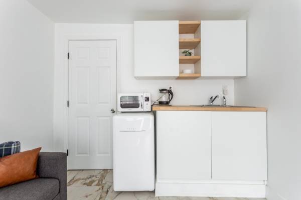The fully furnished unit features a queen-sized bed, a sofa with a convertible queen mattress, a flat-screen television, and high-speed internet access. The compact kitchen area includes a stainless steel sink, microwave, Keurig coffee maker, and other basic necessities. An elegant French door opens to reveal a calming view of the garden. The bathroom, finished with marble tiles, is equipped with a walk-in shower, a wall-mounted vanity, and an illuminated mirror, contributing a sense of refinement.
