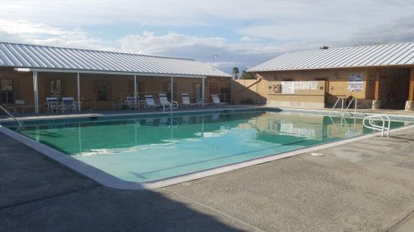 This space boasts the best location in the park, situated directly across from the clubhouse and the pool area, which features mineral hot water and jacuzzis. The lot includes pavers and a concrete patio. An 8.5\' by 9.5\' shed is provided, complete with electricity, a refrigerator, a large workbench with a vice, and a sound system. A portable privacy fence on wheels is also included.