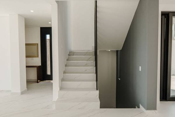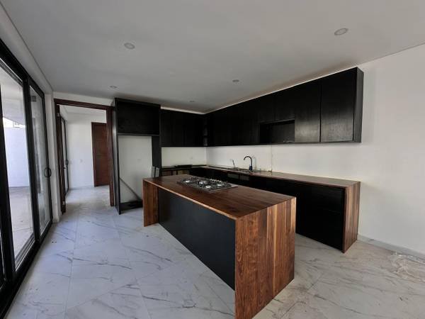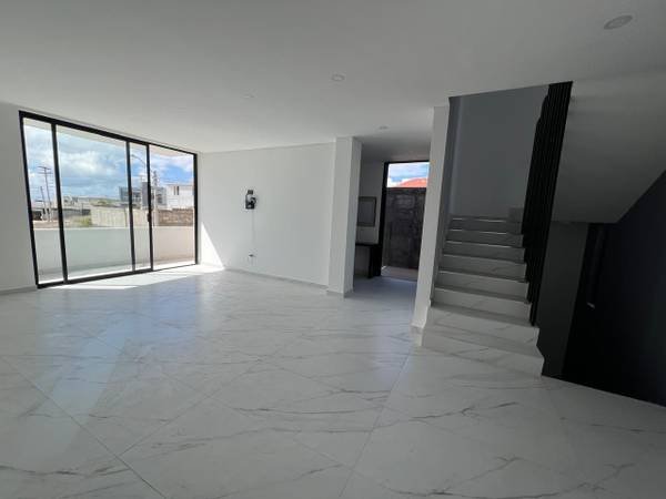 This is a luxurious corner residence available for purchase, featuring three levels of living space. The property includes four bedrooms, a living room, a fully integrated kitchen with a central island, a formal dining area, three and a half bathrooms, a dedicated laundry room, and a storage area. Additional amenities consist of a private water cistern, a natural gas well, ample closet space, a generous backyard, and parking facilities for up to six vehicles, complete with automated gates.
