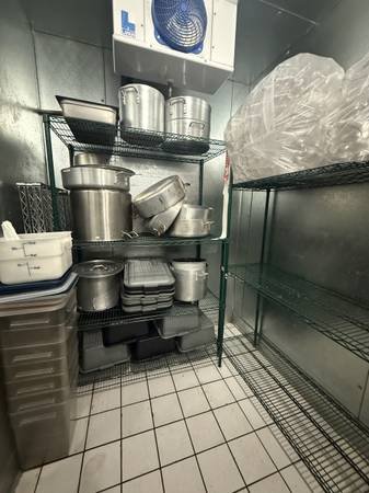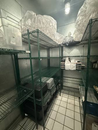 LBC roll-in bread oven, convection oven, six-burner range, stock pot burner, deep fryer, warming oven and bread proofing cabinet, large dough mixer, and smaller appliances including Vitamix XL models, KitchenAid mixer, Robot Coupe units, along with assorted racks and shelving. A large walk-in freezer and refrigerator are also provided.