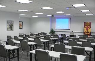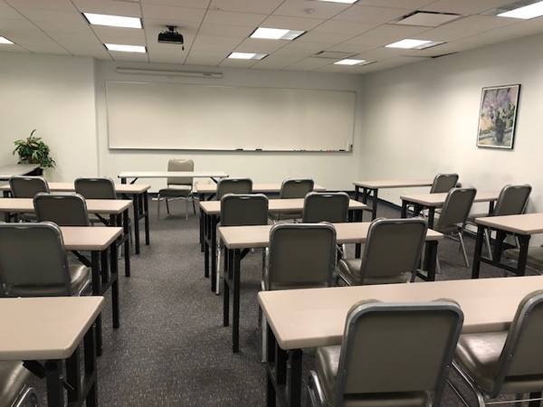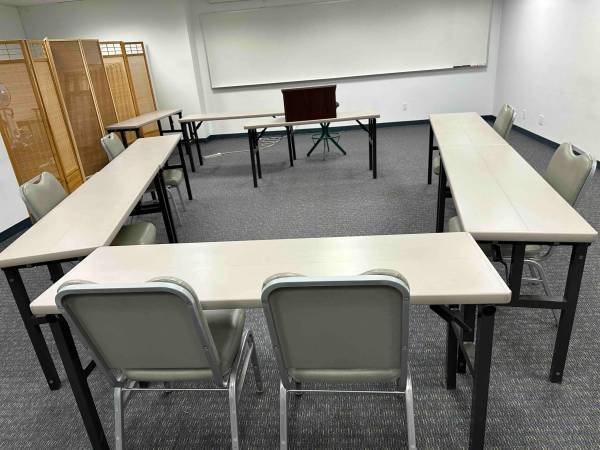 The space can be configured to host up to 45 individuals in a classroom-style seating arrangement.