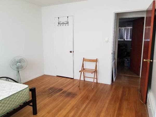 A lovely, sunlit room is available within a two-bedroom, first-floor apartment situated in one of Alhambra\'s most desirable and well-connected neighborhoods. The room is generously proportioned and comes furnished with a cozy full-size bed, a desk, a chair, and a table lamp. It offers ample storage, featuring both a walk-in closet and an additional closet unit comprising a spacious upper cabinet and two lower drawers. A large window fitted with sliding glass panels and blinds completes the space.