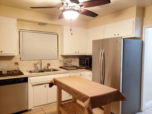 The room is furnished with a full-size bed, a closet, and a dresser. The house has been recently renovated and is situated in a peaceful area. Amenities include a Washer and Dryer, an Electric Kitchen Stove, two Large Refrigerators (to be shared between two people each), a Microwave, and dedicated kitchen storage space for each of the four residents. Please note, this is a standalone house, not a condominium or apartment.