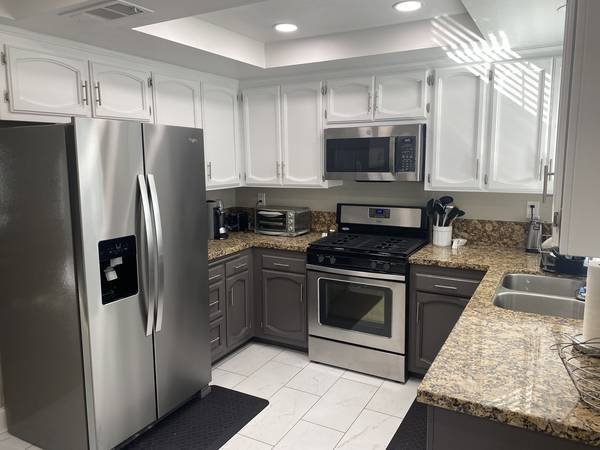 One bedroom is available for rent within a three-bedroom townhouse. The residence is situated in a peaceful neighborhood with ample community parking. It is conveniently located just a fifteen-minute drive from both Malibu and Pepperdine University. The lease term is for one year.