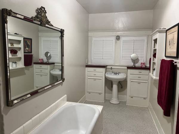 This charming residence offers wireless internet and cable television. The bedroom comes fully furnished, featuring a luxurious king-sized bed, a dresser, a comfortable leather chair, a desk (not pictured), and a television. The room is bright and airy with numerous windows providing ample natural light. The private bathroom includes both a bathtub and a shower.