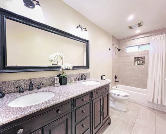 A separate, shared bathroom is equipped with dual sinks. I value peaceful and tidy individuals. As an artist, writer, and performer, I frequently work from my studio or on set. This home is a sanctuary, a place for rest and rejuvenation. Tenants must be employed at least part-time outside the home.