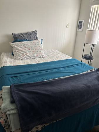The property is meticulously maintained. The room includes a full-size bed, a closet, blackout curtains, and a dresser. The entire apartment boasts beautiful renovations and high ceilings.