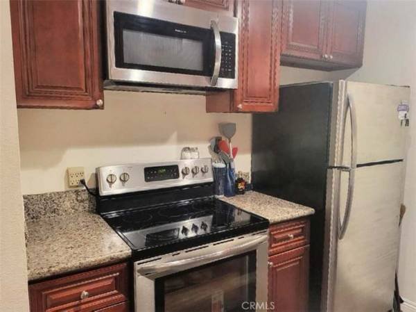 The updated kitchen is equipped with stone countertops, tile flooring, recessed lighting, a stainless steel sink, built-in microwave and dishwasher, an oven/range combination, and a refrigerator. The full bathroom offers a combined tiled shower and jetted spa tub, tile flooring, a built-in medicine cabinet, a bidet, and an attractive vanity with mirror. The living room includes a glass slider door opening to a patio. The bedroom provides two closets and a ceiling fan.