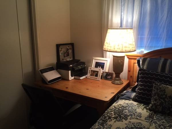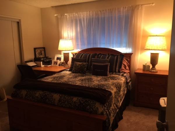 The available room measures 14 by 12 feet and features a spacious closet. It comes furnished with a queen-sized bed, dresser, desk, mini refrigerator, and microwave. Monthly rent encompasses wireless internet, essential bathroom supplies (toilet paper, paper towels, hand soap, and sanitizer), and laundry supplies (detergent pods and fabric softener). Professional housekeeping services clean the bedroom, bathrooms, and kitchen on a bi-weekly basis. Street parking is readily available. A television is provided, though it requires a streaming device such as a Firestick.