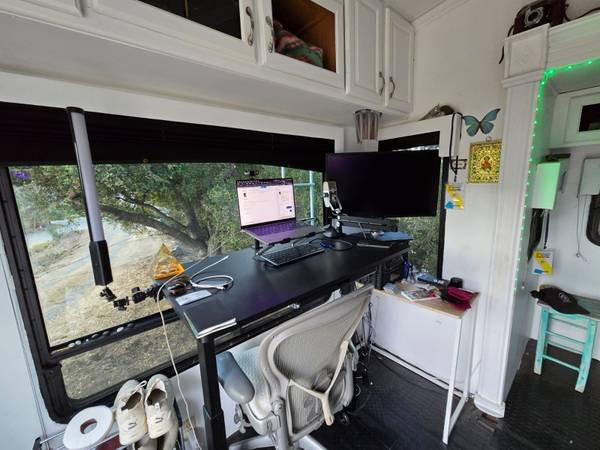 This expansive trailer offers full amenities and breathtaking views, situated in the heart of Topanga town. You\'ll be within easy reach of a grocery store, coffee shops, and restaurants. Three hiking trails are just a five-minute walk away. The home itself is lovely, offering both generous space and a cozy atmosphere. It comes fully furnished, including a standing desk, and features super-fast wifi along with central air conditioning and heating.