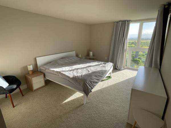 - Master bedroom furnished with a king-size Tuft and Needle Mint mattress and blackout curtains
