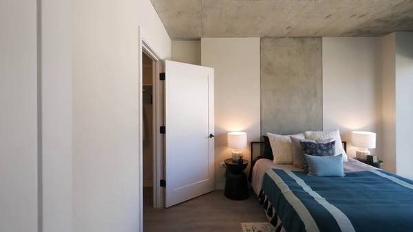 The bedroom is furnished with a full-size bed, a spacious closet, blackout curtains, and a dresser. The entire apartment features beautiful renovations and high ceilings. The modern living area adjoins a recently updated kitchen equipped with a dishwasher, stainless steel appliances, and granite countertops.