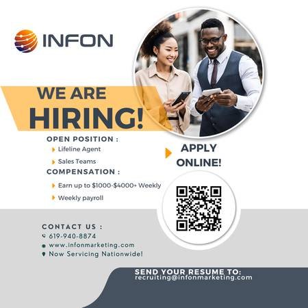 Unlock your potential and grow with our team. Infon stands as a leading Master agency, collaborating with the nation\'s most prominent Lifeline and ACP ETC providers. We are seeking motivated individuals to join us. We have transformed the standard Lifeline and ACP model by introducing the industry\'s most robust and competitive compensation plan. We implemented efficient practices and inventory management systems to minimize agent downtime. Our leadership brings over 15 years of expertise in distribution, marketing, and advanced technology manufacturing, all dedicated to supporting your success. If you desire a dynamic and fulfilling career with limitless income possibilities, we encourage you to develop your future with us.