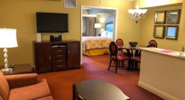 The room is a one-bedroom condominium featuring a king-sized bed, a full living room, a complete kitchen, and a sofa sleeper.