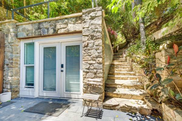The fully furnished unit features a queen-sized bed, a sofa with a convertible queen mattress, a flat-screen television, and high-speed internet access. The compact kitchen area includes a stainless steel sink, microwave, Keurig coffee maker, and other basic necessities. An elegant French door opens to reveal a calming view of the garden. The bathroom, finished with marble tiles, is equipped with a walk-in shower, a wall-mounted vanity, and an illuminated mirror, contributing a sense of refinement.