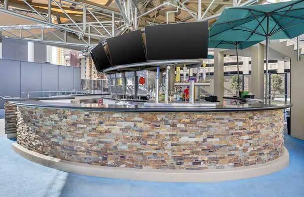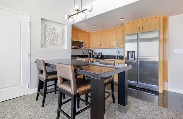 This 1,256 square foot premier suite includes a home theater projector, a full kitchen, and a sofa bed. The primary bedroom is furnished with a king-sized bed, a 49-inch television, a full-length mirror, and a USB charging port. The guest bedroom also contains a king bed, a 49-inch TV, a full-length mirror, and a kitchenette. The primary bathroom features an oversized jetted tub and a separate shower, while the guest bathroom is equipped with a shower.