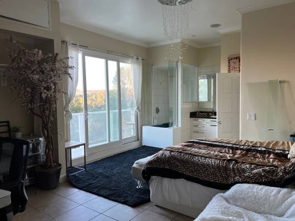 Hello! I am offering a beautiful, spacious master bedroom located within a hillside mansion that boasts stunning views. The property features a jacuzzi, an expansive private balcony, a private bath, and an incredible vista. The absence of pets is a positive aspect. The room itself is very large and includes a huge private balcony overlooking Los Angeles. Additionally, there is a substantial backyard, a kitchen, and parking available by the house.