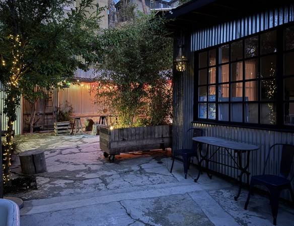 The property offers a quiet and peaceful atmosphere with access to outdoor areas. It features a two-room artist studio divided by a pocket door, situated on the ground level. The location is convenient, approximately 10 minutes from downtown Los Angeles or Highland Park. Other artists are present on the premises.