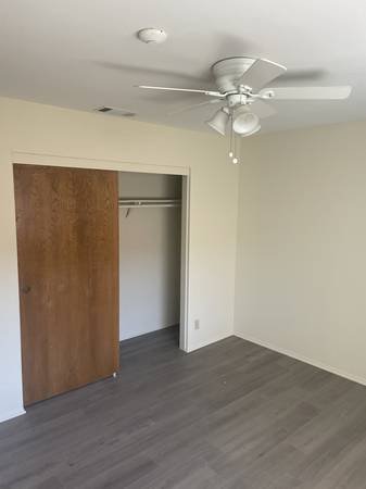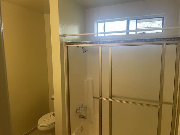 The bedroom is a private space. Common areas of the home include a shared kitchen, a living room, and a compact rear patio that receives pleasant sunlight. An in-unit washer and dryer are provided for resident use. Finding street parking in the surrounding neighborhood is typically not difficult.