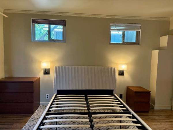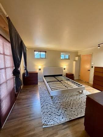 This newly renovated space features a private, full bathroom and comes fully furnished with a queen-sized bed, dressers, and nightstands. It boasts wood flooring, an expansive walk-in closet, and windows that fill the room with natural light. French doors open directly to a cozy porch and the serene backyard.
