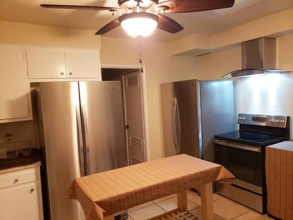 The room is furnished with a full-size bed, a closet, and a dresser. The house has been recently renovated and is situated in a peaceful area. Amenities include a Washer and Dryer, an Electric Kitchen Stove, two Large Refrigerators (to be shared between two people each), a Microwave, and dedicated kitchen storage space for each of the four residents. Please note, this is a standalone house, not a condominium or apartment.