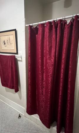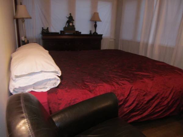 This charming residence offers wireless internet and cable television. The bedroom comes fully furnished, featuring a luxurious king-sized bed, a dresser, a comfortable leather chair, a desk (not pictured), and a television. The room is bright and airy with numerous windows providing ample natural light. The private bathroom includes both a bathtub and a shower.