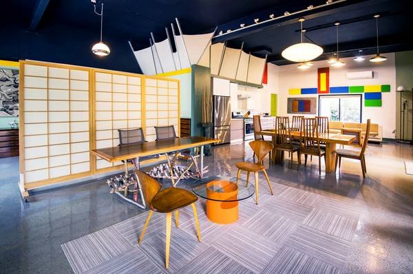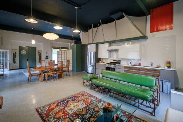 This furnished loft apartment offers generous space and high cathedral ceilings, situated within a distinctive, tree-enclosed setting in the Sherwood Forest area near California State University, Northridge.