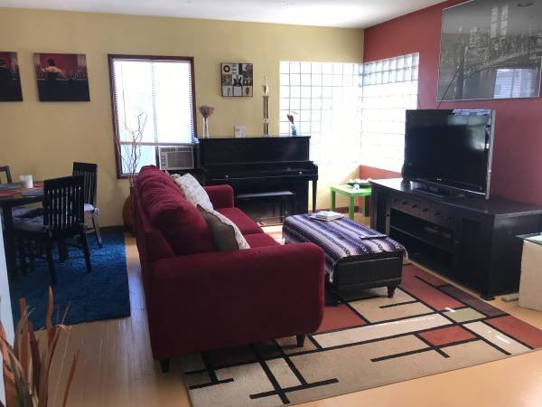 - Includes a sofa, piano, and a 46-inch flat-screen HDTV.