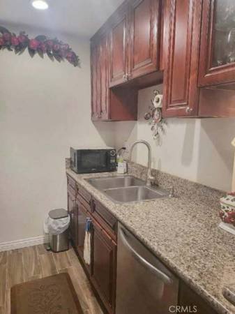 The updated kitchen is equipped with stone countertops, tile flooring, recessed lighting, a stainless steel sink, built-in microwave and dishwasher, an oven/range combination, and a refrigerator. The full bathroom offers a combined tiled shower and jetted spa tub, tile flooring, a built-in medicine cabinet, a bidet, and an attractive vanity with mirror. The living room includes a glass slider door opening to a patio. The bedroom provides two closets and a ceiling fan.
