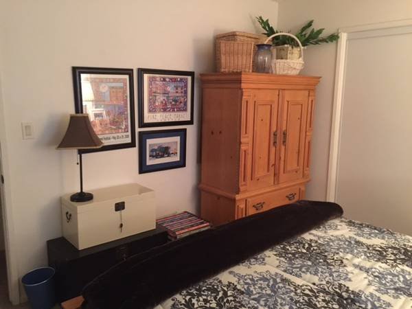 The available room measures 14 by 12 feet and features a spacious closet. It comes furnished with a queen-sized bed, dresser, desk, mini refrigerator, and microwave. Monthly rent encompasses wireless internet, essential bathroom supplies (toilet paper, paper towels, hand soap, and sanitizer), and laundry supplies (detergent pods and fabric softener). Professional housekeeping services clean the bedroom, bathrooms, and kitchen on a bi-weekly basis. Street parking is readily available. A television is provided, though it requires a streaming device such as a Firestick.
