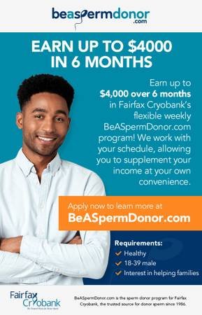 The sperm donor initiative at Fairfax Cryobank is currently seeking healthy male participants, between the ages of 18 and 39, who reside in Pasadena and the broader Los Angeles region. To discover how you can assist families in need and simultaneously receive compensation of up to $4000 over a six-month period, submit your application at BeASpermDonor.com.